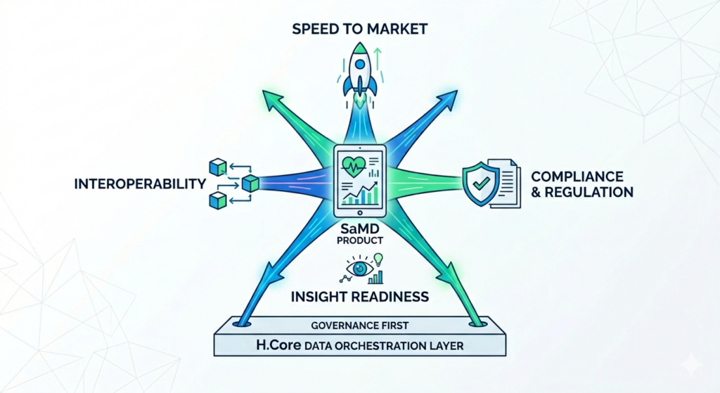 When you build Software as a Medical Device, you are permanently navigating four forces that pull against each other simultaneously: you need to ship fast because the company depends on it, you cannot cut compliance corners because the regulator will find them (and so will patients), you need to engineer the data layer in a way that makes it genuinely useful once real-world data begins to accumulate, and you need to do all of this without creating another silo that future teams will inherit and curse.